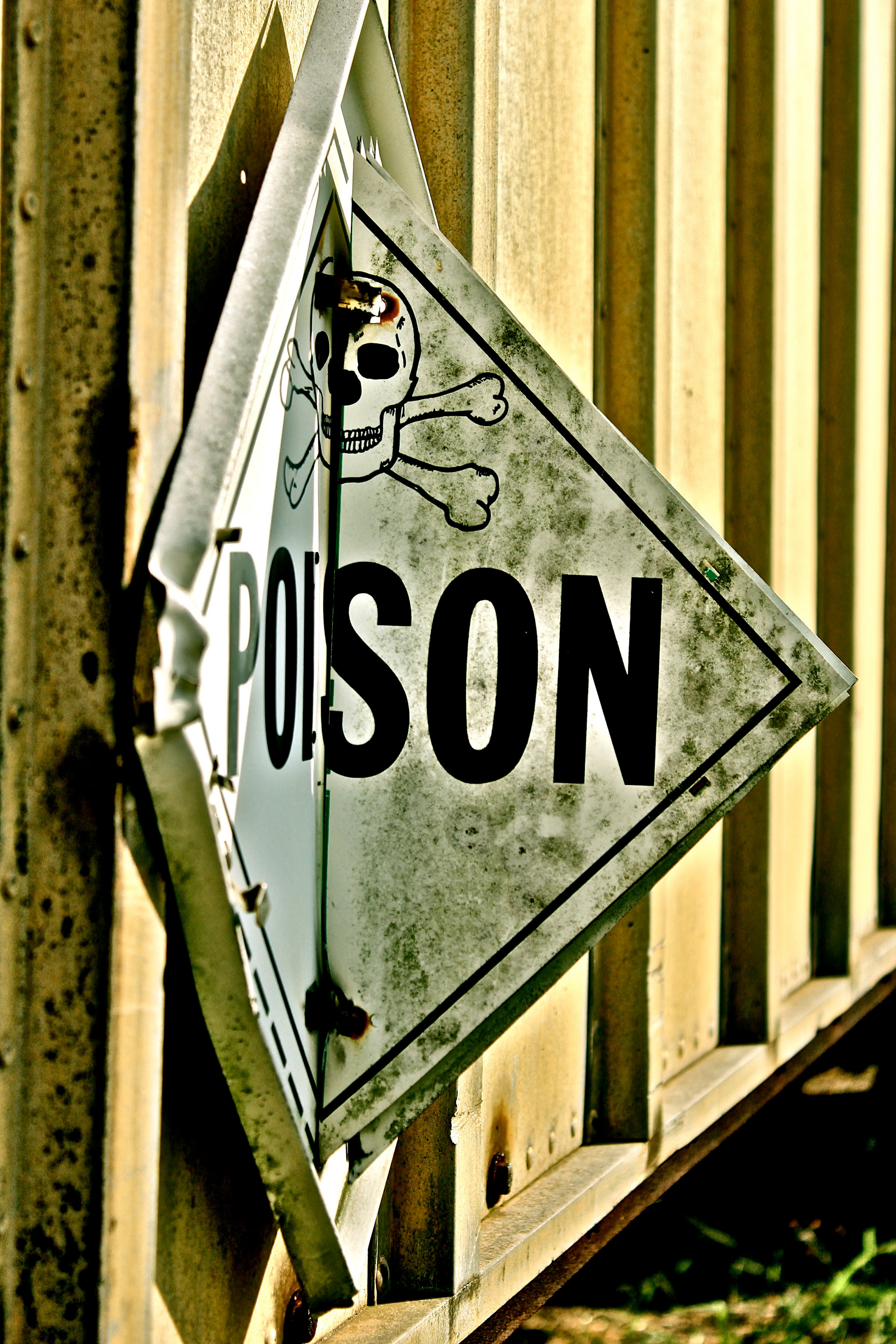 Sign found on the side of an abandoned truck -- one side flipped open to say "Poison," the other side said, "Drive Safe."